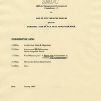 Programme and preparation paperwork for Lane End conference on Black Arts Management (1994); Skills and Management Development Consultancy for the Black Theatre Forum: inventory and profile; Information on the seminar A Black Arts Administrator or a Black Arts Administrator; brochure of HTS, specialists in training facilities; copies on cross validation and standards for managers to achieve the organisation objectives and improve performance.