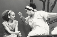 Black and white photographs (prints and contact sheets) showing various rehearsal and staged scenes of the play directed by Malcolm Frederick. Some of the pictures are credited to Paul Thompson. The play was part of the sixth Black Theatre Season. Actors include Ellen Thomas, Stephan Kalipha, Basil Otoin, Paul McKenzie.