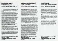 Black and white photographs of actors. Includes Alibe Parsons, Tom Watt (portrait), Loose Ends (group), Allister Bain and unidentified artists. Biography on Edgar White, author of Moon Dance Night.