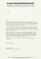 Fourth Black Theatre Season information and administration. Correspondence and responses to invitation to the Royal Gala Performance of Moon Dance Night by Edgar White. Letters of thanks including Prince Edward's. Letters from the House of Commons regarding the opening event of the Black Theatre Season 1987. Includes a RSVP card from MPs Paul Boateng and Diane Abbott. Invitation letters describe the highlights of the festival to guests. Response letters are thank-you notes or apologies for not attending event.